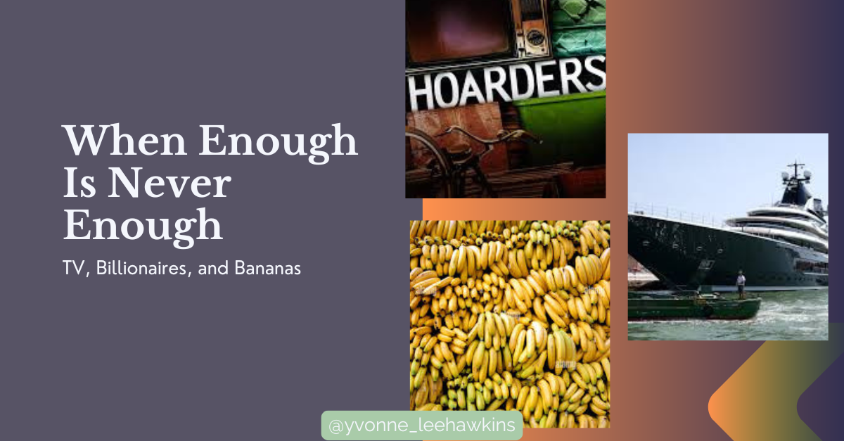 I am not, to be clear, suggesting that billionaires are mentally ill. That would be both reductive and probably libelous. What I am suggesting is that we have constructed a society with a remarkably inconsistent relationship to nature. In nature, if you’re a monkey who hoards all the bananas, not only will the other monkeys come take them from you, but the bananas will continue to ripen and decompose. So, it forces the monkey to value enough and cooperative community, instead of accumulation. We made a television show — a very successful one — dedicated to the spectacle of regular people accumulating more than they need, and we watch it as a cautionary tale, a window into dysfunction, a call to action. We feel moved to clean our own homes afterward. We recognize excess when it lives in a two-bedroom ranch in Ohio.